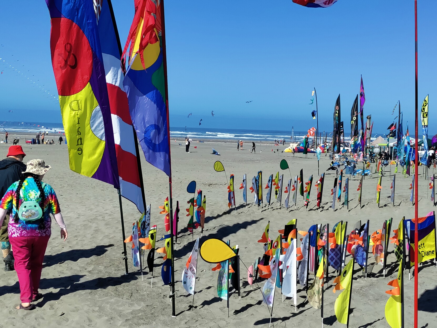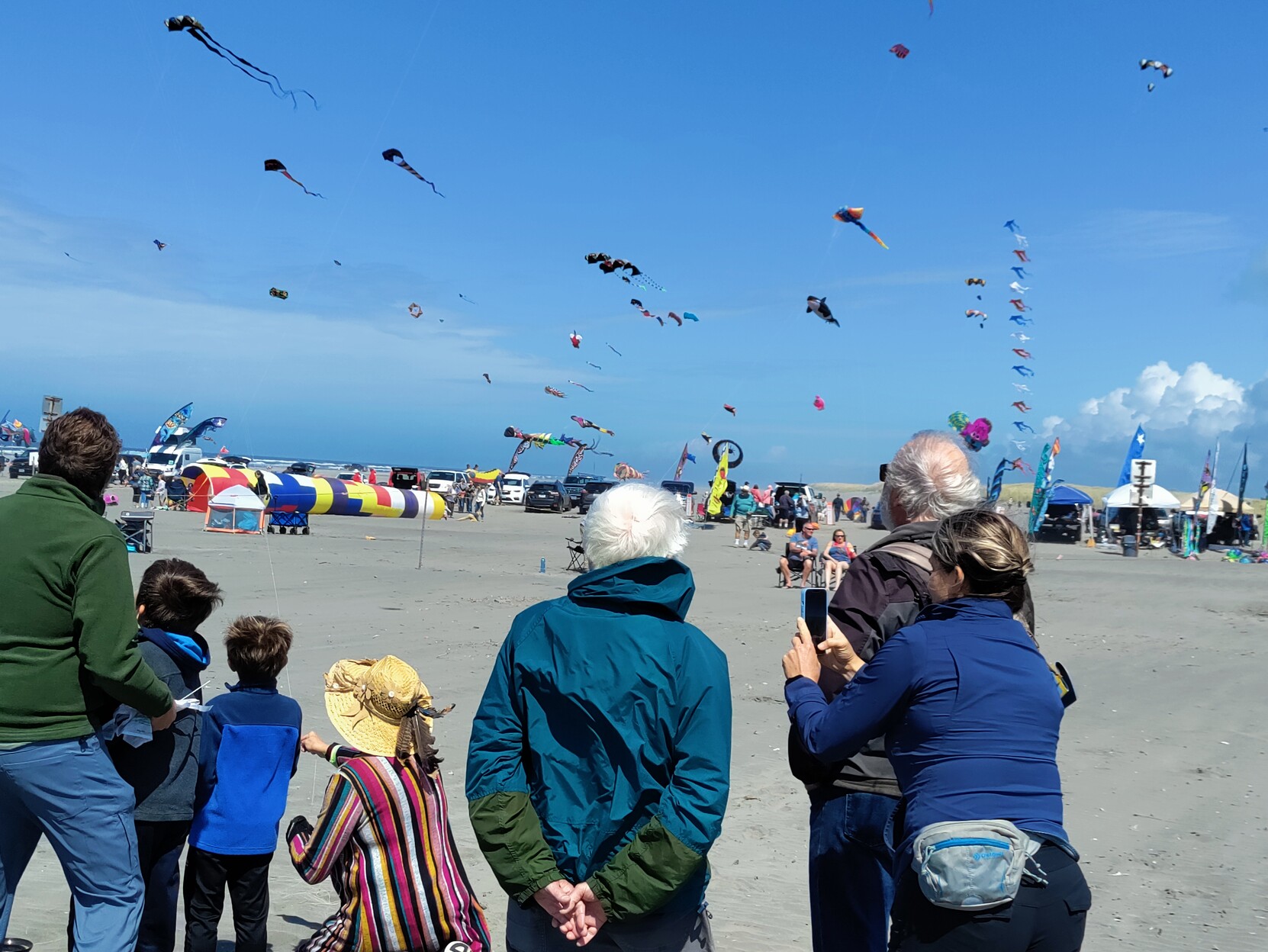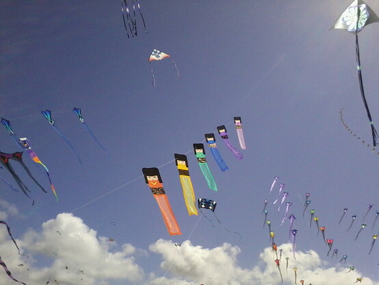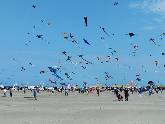 #HappyKiteDay people of Mastodon, from the Washington State International Kite Festival. Monday is kite trains and arches day. In another half hour there is going to be a world record attempt for the number of 4 line Rev style kites flown in stacks (kites per person x people flying). This morning was light wind (4-6mph) and sunny, this afternoon is moderate wind, 8-12mph and continued sun. No smoky air on the WA coast. Temp. 65°F in the shade.