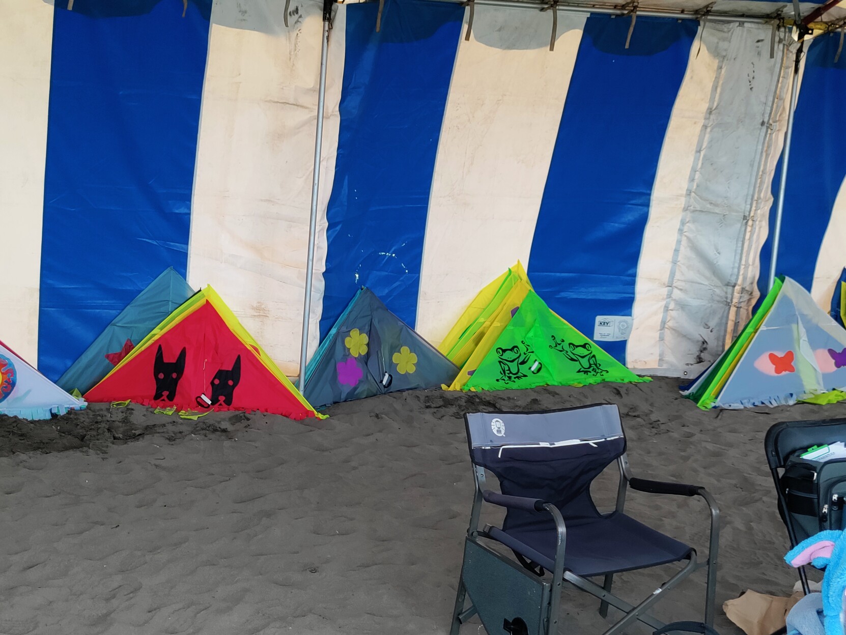 #HappyKiteDay from Terrific Tuesday at the Washington State International Kite Festival. Today's activities have been various. Tuesday has been PunDay, Camp and Ground Display judging, cumulative Team judging, we just had the single line fighter kite demo/class, and individual rokkaku fighting is up next with team rok battles at 3pm. Wind has been heavy with 12-18 mph winds all morning as storm clouds move through, although no rain at the beach so far. Partly sunny.