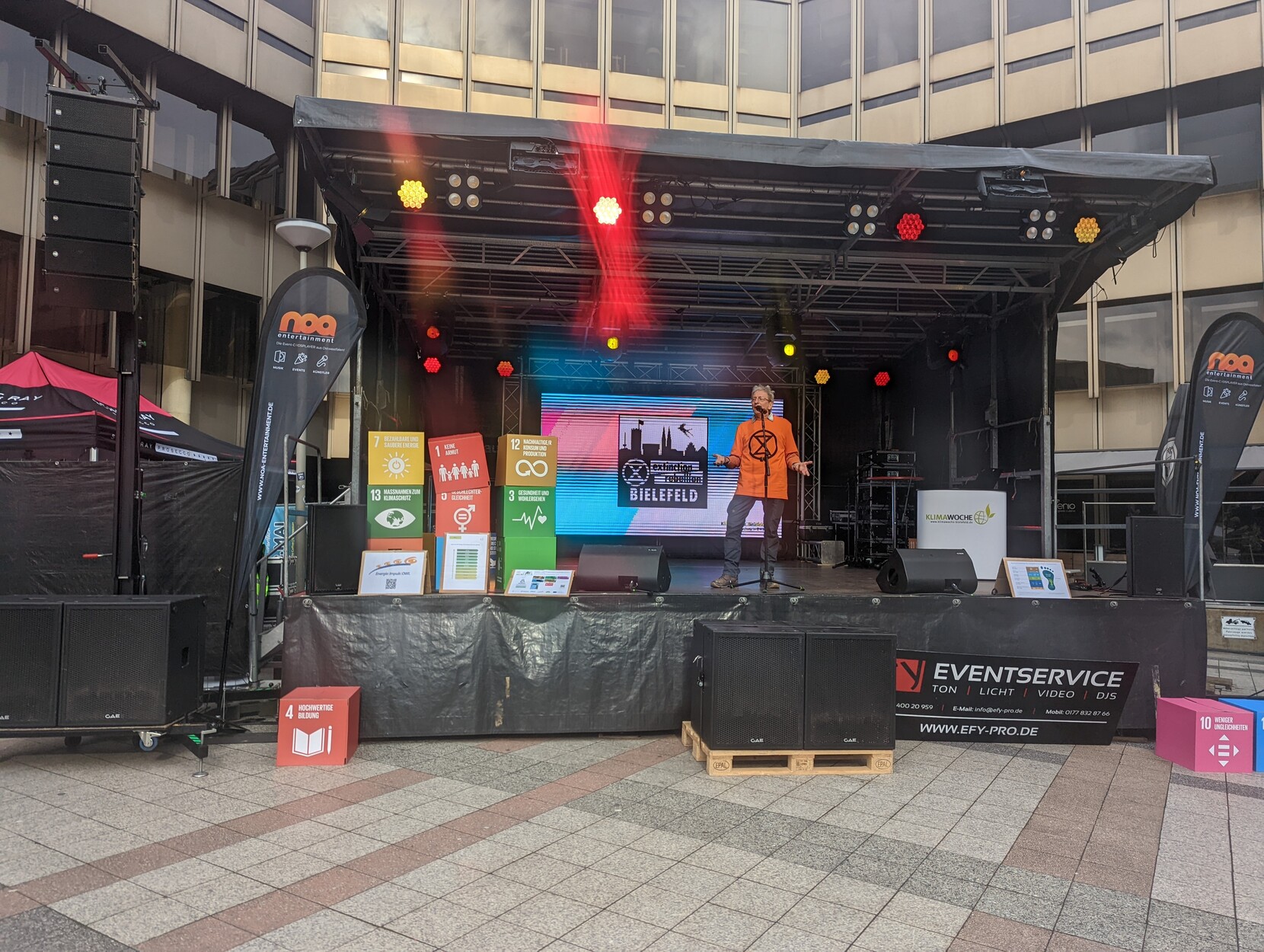 Eben auf der Bühne der #Klimawoche #Bielefeld Thomas erklärt das man jetzt Aktiv werden muss um die Schlimmsten Folgen der #Klimakrise noch abzuwenden.