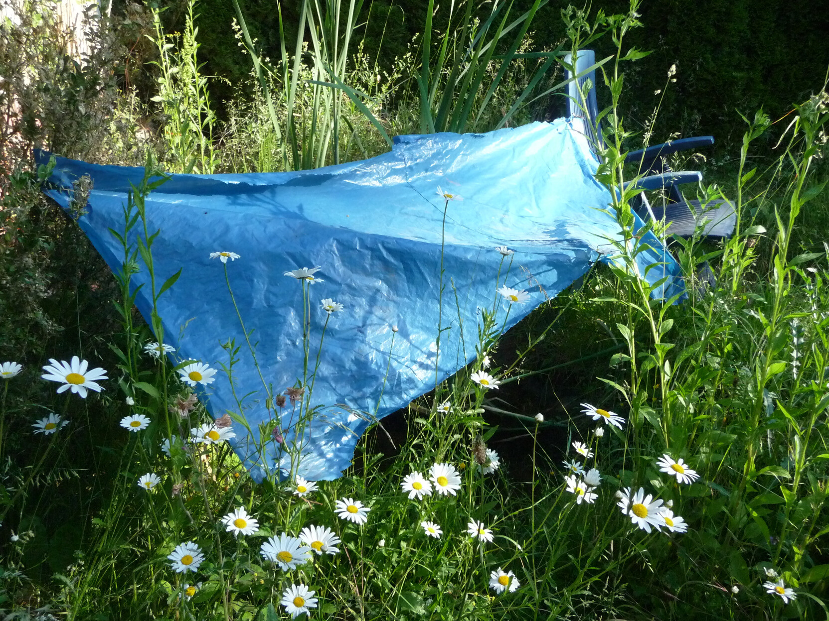 Tag 26 ohne richtigen Regen. Der Tümpel hat noch etwas Regenwasser von mir bekommen. Nur wenig, ich werde knausrig. Habe 5 Tonnen, reicht trotzdem nicht bei wochenlanger Trockenheit. Leitungswasser soll man für Teiche nicht nehmen. Das Wasser ist zu hart. Und dem Tümpel hab ich jetzt aus einer großen Mülltüte einen Sonnenschutz gebaut. Sieht doof aus, aber austrocknen ist noch viel doofer. #klimwandel #garten #wasser