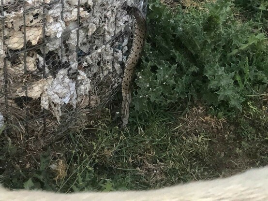 Das war heute Abend ein interessanter Besucher. Es ist nicht die erste #Schlange, wir finden. Aber neu ist, daß sie aus unserem #Komposthaufen (humanure) kommt. Die Hunde waren begeistert.