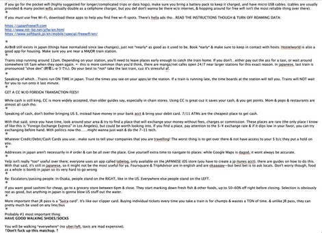 This might be a little too late for most, but if anyone's going to Japan, I wrote up a few helpful tips for someone awhile back.