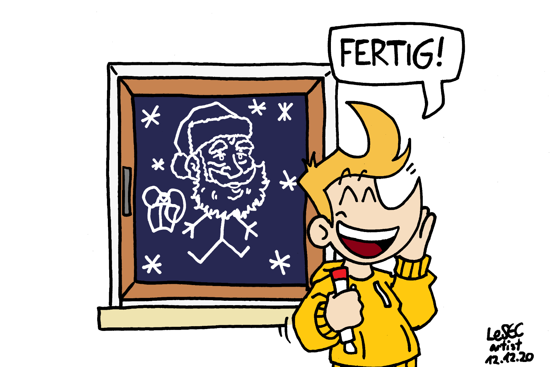 #Adventskalender #Weihnachten #Fensterdeko #Kreidemarker #Weihnachtsmann #Strichmännchen #Künstlerleben #Motivation #Comic #Illustration #kleineKunstklasse