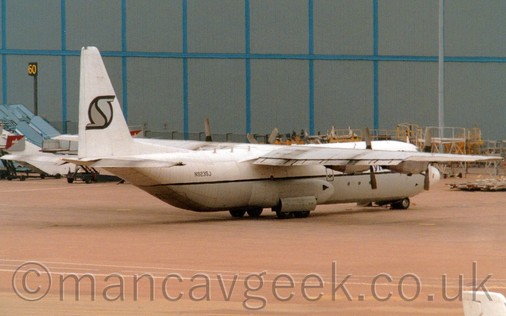N923SJ, Lockheed L100-30, Southern Air Transport, parked at Manchester Airport, some time in the 1990s.