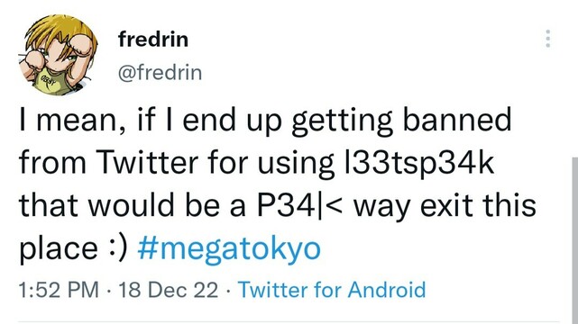 I'm quite proud of this tweet. Even just adding 'she's at botsin.space' was enough to get it deleted on the first try. l33tsp34k being handy after all these years still amuses me to no end. #twitterblock #twitter #follow #l33tsp34k