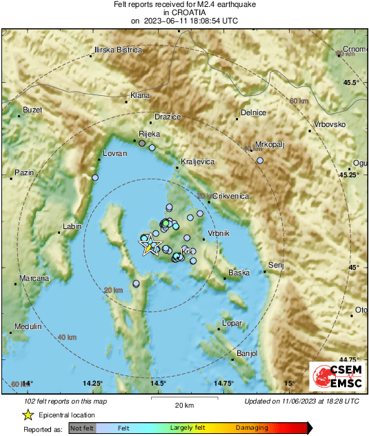 #Earthquake 28 km E of #Labin (#Croatia) 21 min ago (local time 20:08:54). Updated map - Colored dots represent local shaking & damage level reported by eyewitnesses. Share your experience via: