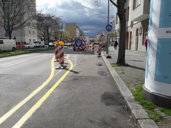 #BerlinerStraße Wilmersdorf Baustelleneinrichtung zur Verbreiterung der Mittelinsel an der Querung der Fahrradstraße Prinzregentenstraße und endgültiger Sperrung diieser Querung für MIV, nur noch für Fuß und Rad.