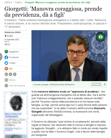 Giorgetti rivendica una "manovra coraggiosissima, che ha preso risorse dalla previdenza e le ha messe sulla famiglia, sui figli, perché senza figli non ci sarà riforma delle pensioni che sia sostenibile". In pratica sta mettendo le mani in tasca agli anziani facendo credere che figli non fanno nipoti perché il nonno prende troppi soldi e non perché loro sono troppo precari e i salari italiani sono i più bassi d'Europa. E questo è quello che voleva abolire i medici di base. #lalegatifrega