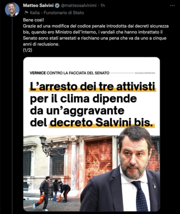 Salvini non ha denunciato Bossi per i 49 milioni di euro rubati ai contribuenti italiani, e così lo ha salvato dal processo con l'aiuto del #PD che ha cambiato il reato di appropriazione indebita col governo Gentiloni. Essere complice morale di favoreggiamento in appropriazione indebita lo priva di ogni titolo per atteggiarsi a campione di legalità. A questo aggiungiamo le foto ricordo con stupratori di minorenni prescritti e cene con delinquenti fascisti. #lalegatifrega #UltimaGenerazione