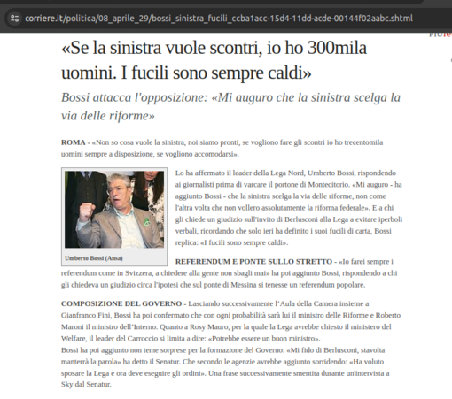 “Mai al governo con la porcilaia fascista" - Diceva il pluripregiudicato Bossi - “Noi della Lega siamo la continuazione dei partigiani che hanno combattuto per la libertà: la Lega non farà mai un accordo politico con i fascisti, o come cavolo si chiamano adesso”.