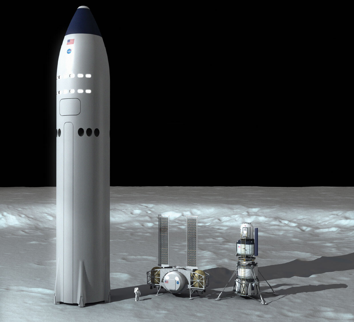 Three proposals for NASA's Human Landing System, part of its upcoming Artemis program of lunar exploration. The one proposed by SpaceX (left one in the image) is so tall, it's adding an elevator to get astronauts to the surface. The other ones are by Dynetics and Blue Origins.