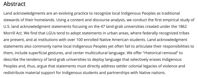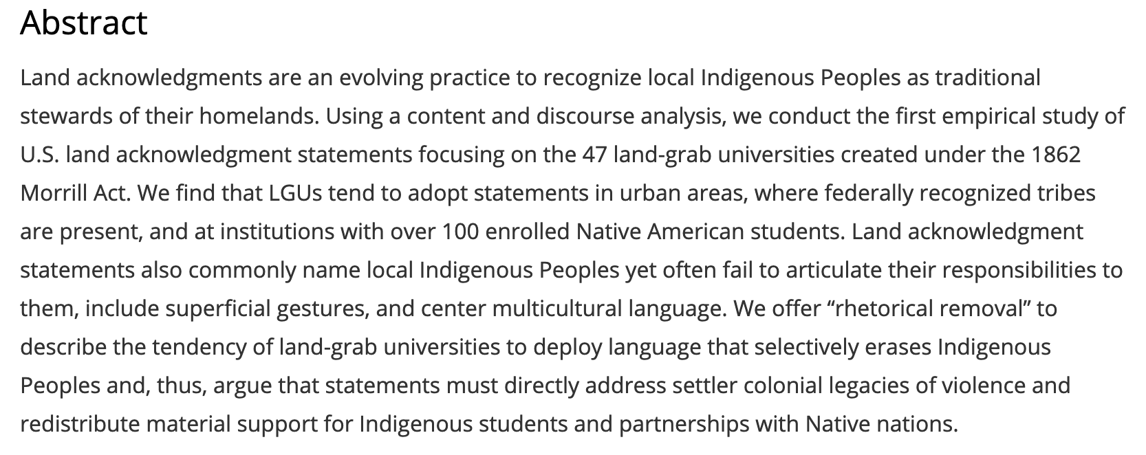 An increasingly important topic >> 'Performance or Progress? The Physical and Rhetorical Removal of Indigenous Peoples in Settler Land Acknowledgments at Land-Grab Universities' https://journals.sagepub.com/doi/full/10.3102/00028312221141981 #highered #landgrantuniversities #firstnations