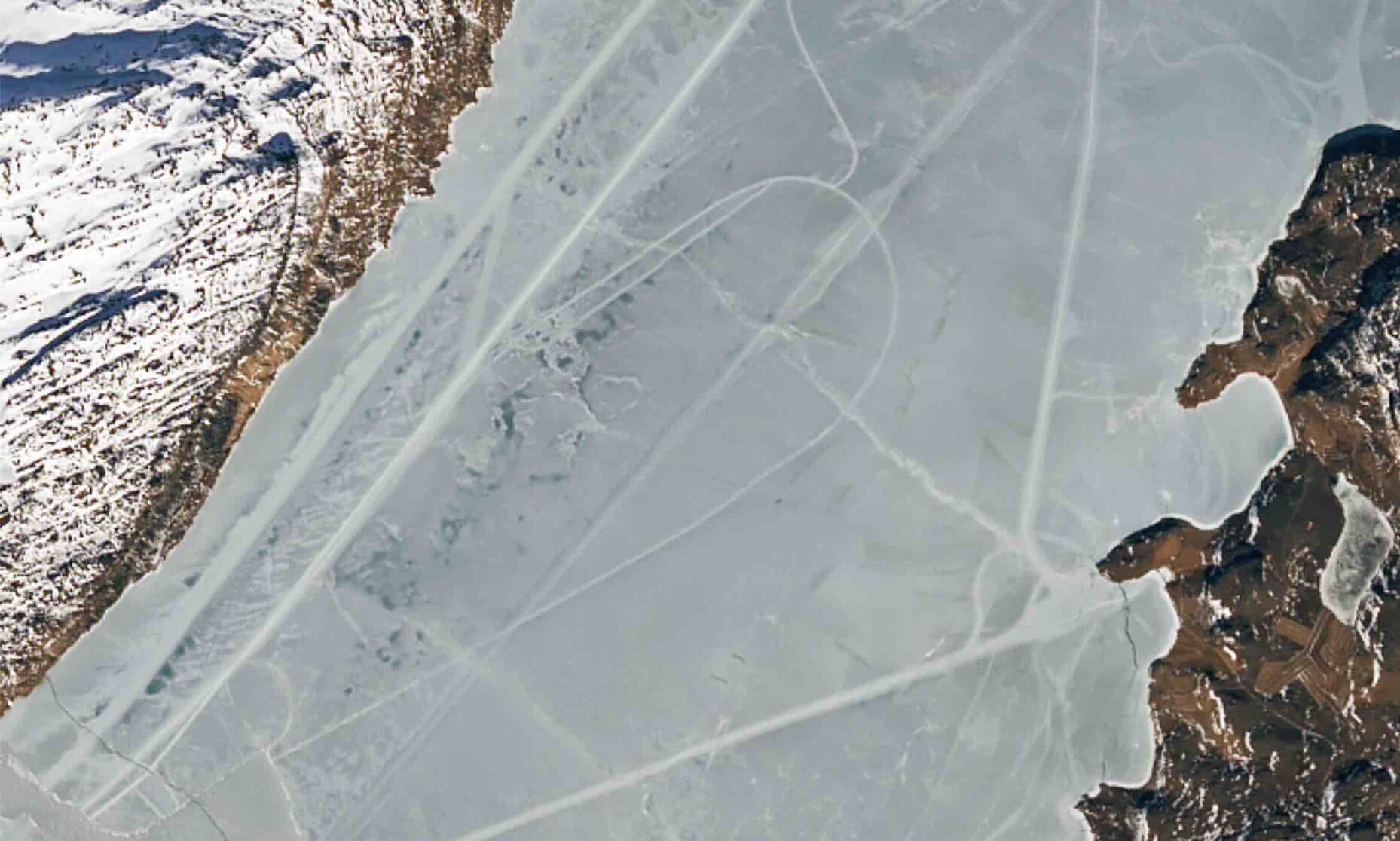 Landsat 9 satellite images over Greenland have revealed mysterious tracks on the ice. The tracks appear to originate from towns along the Tunulliarfik Fjord and form straight lines and loops. NASA scientists suspect that the tracks are caused by vehicles moving across the ice, possibly for hunting or traveling.