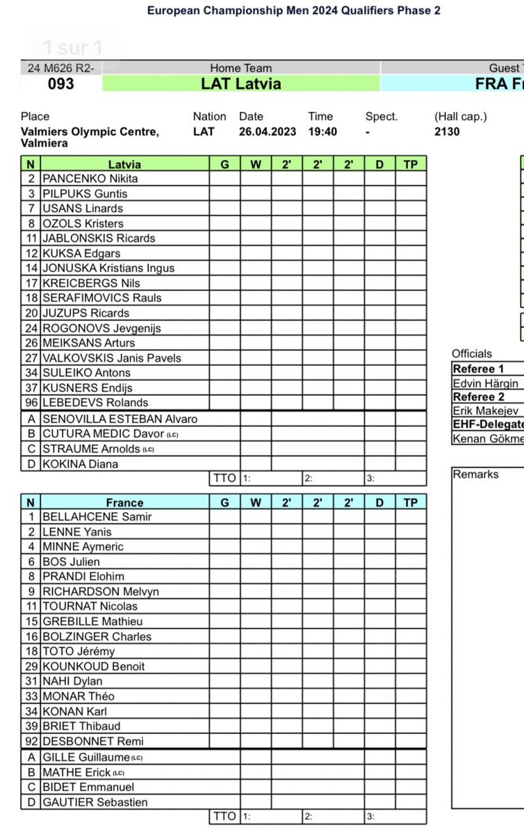 La feuille de match de Lettonie - France avec pour la première fois Bellahcene et Toto #LATFRA