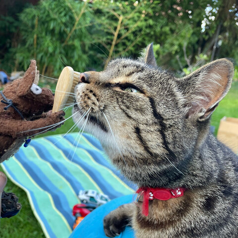 Minimus has persuaded Vibrissa* to let him tidy her vibrissae (whiskers) with his scopula (little brush). She's a little incomptis (unkempt) after sleeping in a testa florum (flowerpot) all day!