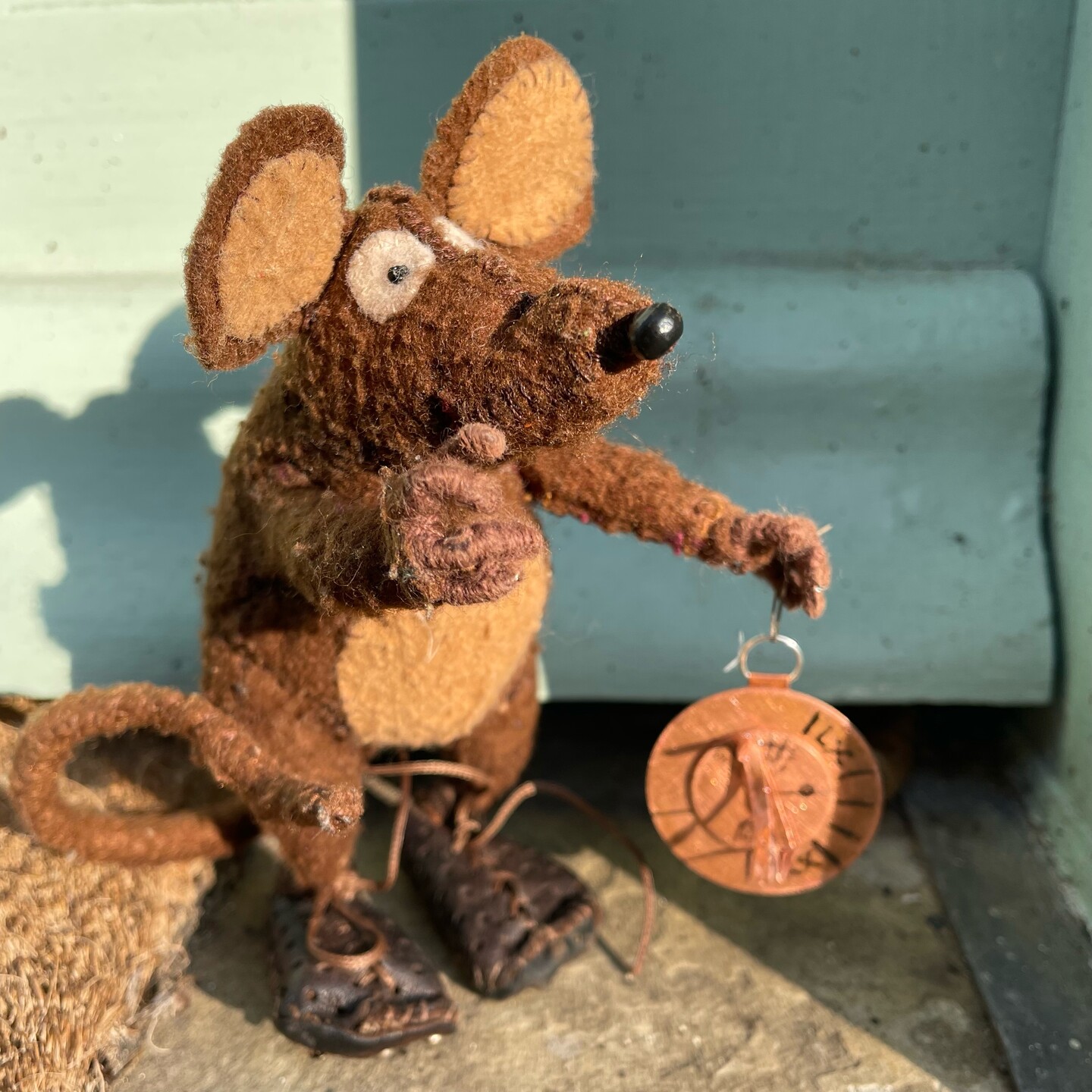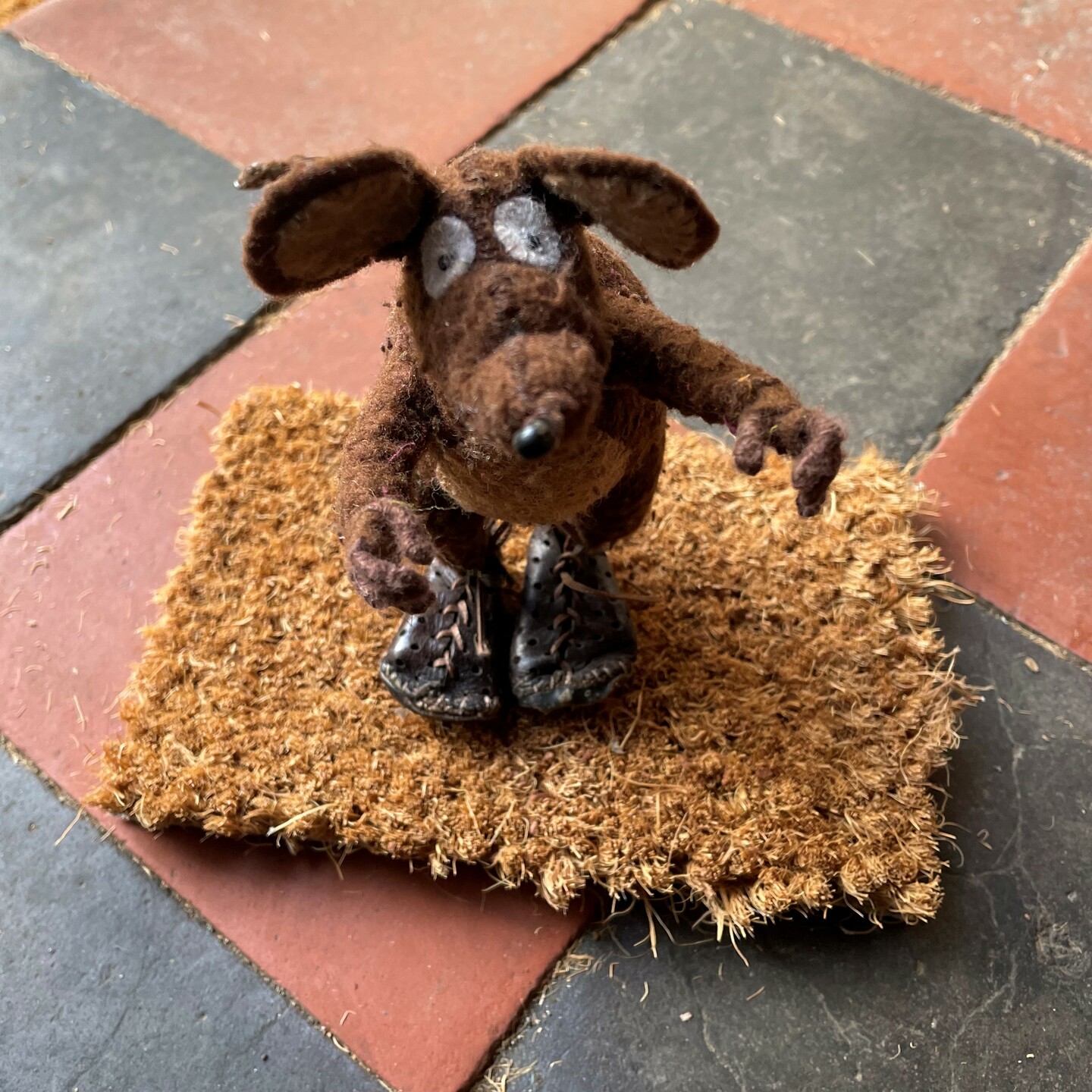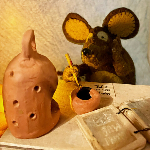 Minimus is a well-mannered mouse, so he's wiping his little caligae (boots) on the storea ianuae (door mat) ...or is it a storea muris (mouse mat)?