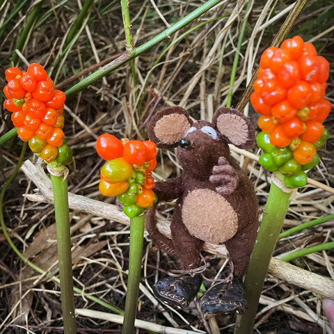 Minimus has found three aron (wild arum) plants with shiny bacae flammeae (orange-red berries). He warns Minima not to nibble them - venenatae sunt (they are poisonous)!