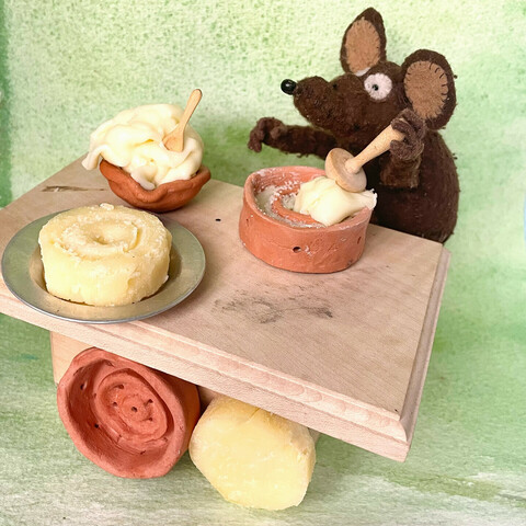 Minimus is busy making caseus (cheese) in a forma (cheese press or mould), spooning in coagulum (curds) and pressing out the serum (whey), turning out the cheese, adding sal (salt) and leaving it to ripen in locus frigidus (a cool place). beati sunt artifices casei (blessed are the cheesemakers)!