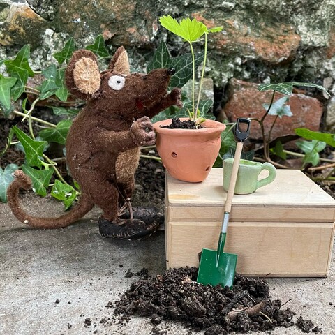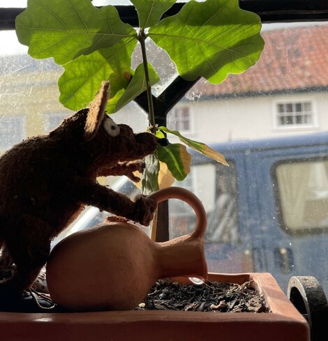 Minimus is watering his arbor novella (seedling) with his new urceus (jug) - he's very proud of the duodecim folia (12 leaves) on the little quercus (oak).