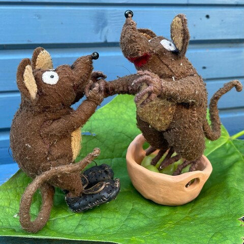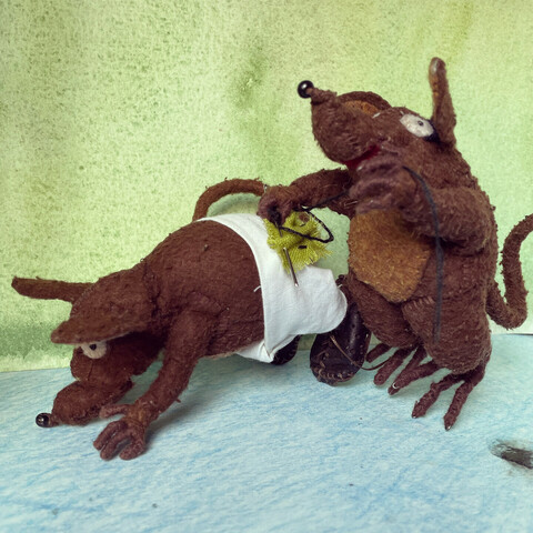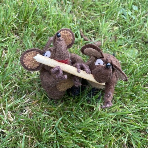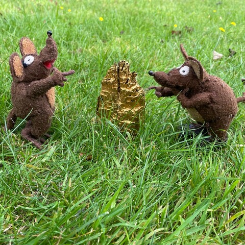 Minimus and Minima have found a strange ligneum (wooden thing) in the garden, pigmento aureo inductum (painted gold). They squeak excitedly while pointing it out inter se (to each other). quid est (what is it)? mures nesciunt (the mice don't know).