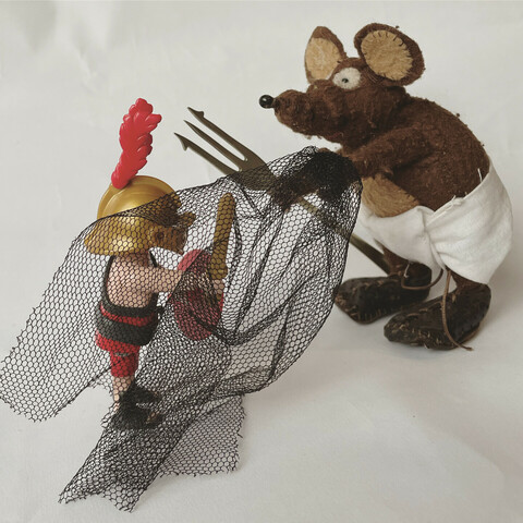 Minimus is competing in the arena as a retiarius (net-fighter), equipped with a tridens (trident) and rete (fishing net). His opponent is a murmillo, armed with a proper gladius (sword), parma (small shield) and galea (helmet). Luckily, the fight is a simulatio (show) and nemo (nobody) will be hurt!