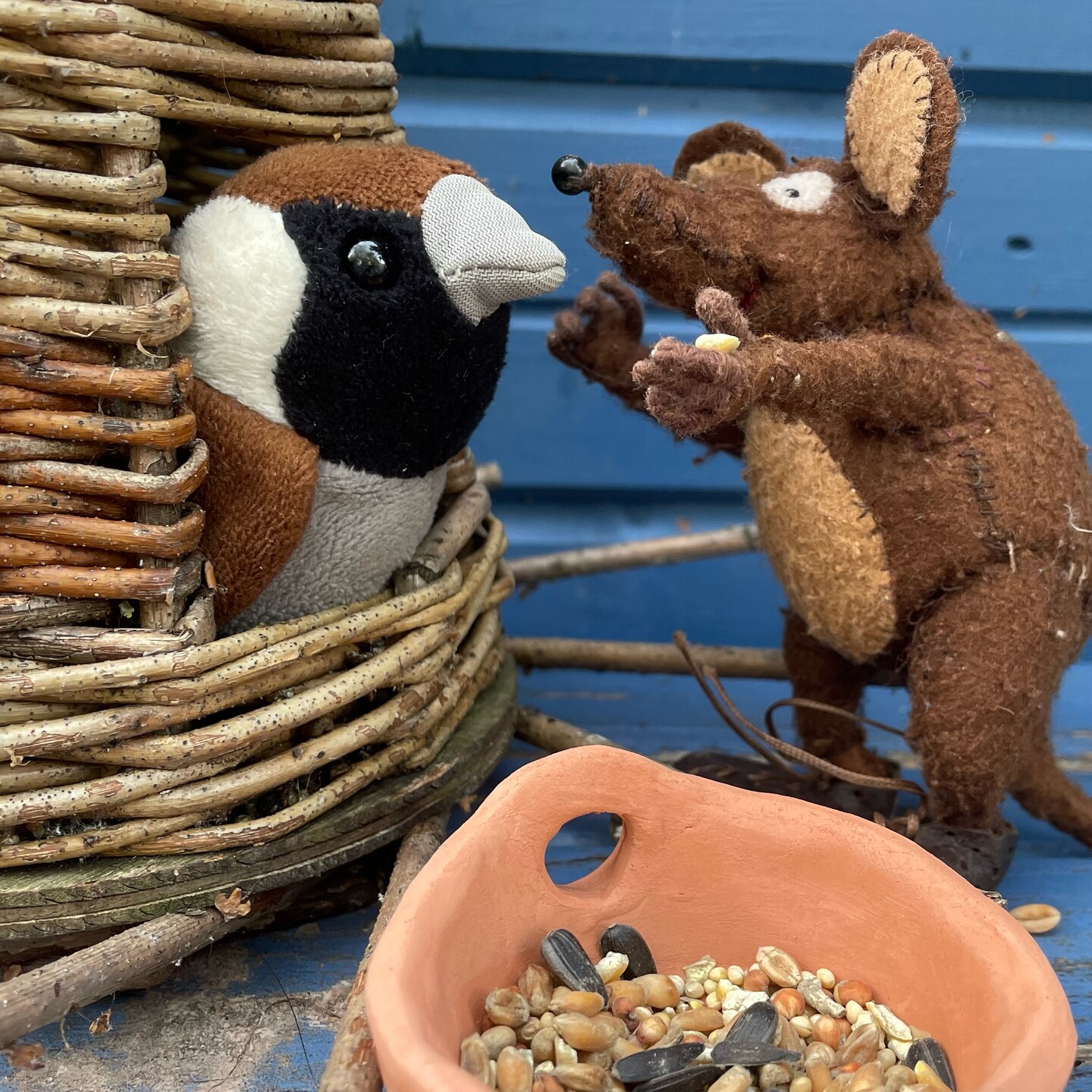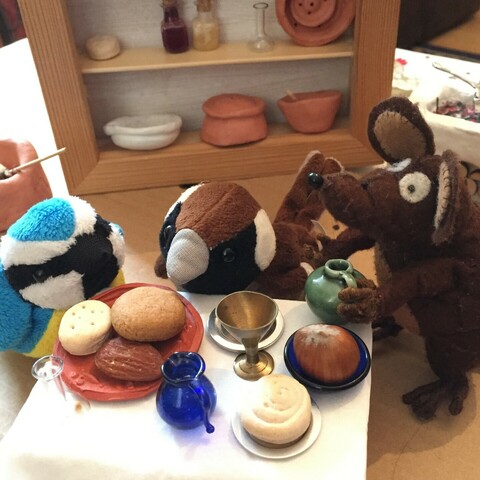 Minimus is entertaining amici (friends); parus (a bluetit) and passer (a sparrow). He is serving amygdalum (an almond), nux avellana (a hazelnut) and panicella (bread rolls) for prima mensa (the first course), then culices (gnats) and caseus (cheese), of course!
