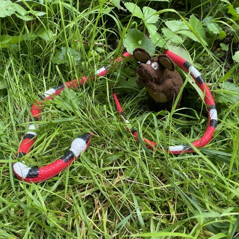 Minimus was not expecting to find a serpens (snake) in the herba (grass) - even a very brave mouse would be a little startled! Luckily for him, this snake is not only benevola (friendly) but also factitia (artificial)...