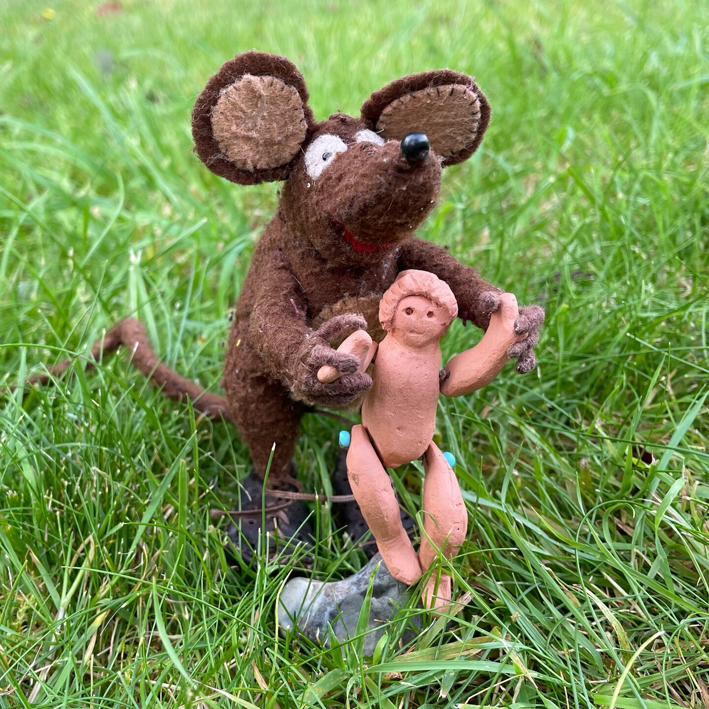 Minimus is holding up his sigillarium (pottery figurine). He particularly likes its little bracchia (arms) and crura (legs) which are articulata (jointed) so he can make it dance!