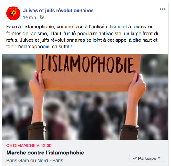 Les Juives et Juifs Révolutionnaires (JJR), @JJR_JJR_JJR@twitter.com, rejoignent l'appel à la marche du 10 novembre contre l'#islamophobie au nom de "l'unité populaire antiraciste".