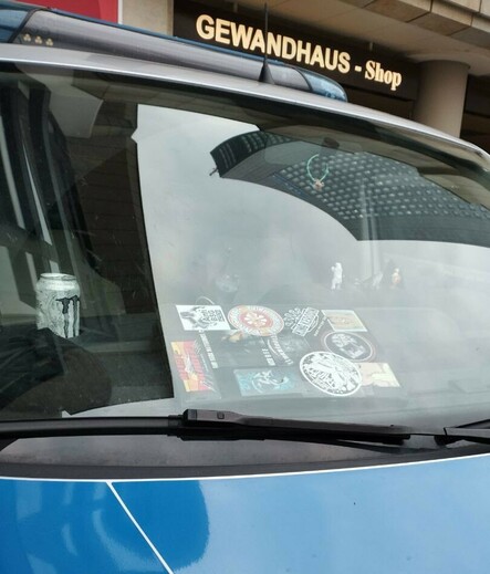 Bei der Polizei Sachsen erfreut man sich an „KingKerosin“ und „AntiBSGChemie“ Stickern. #le1704