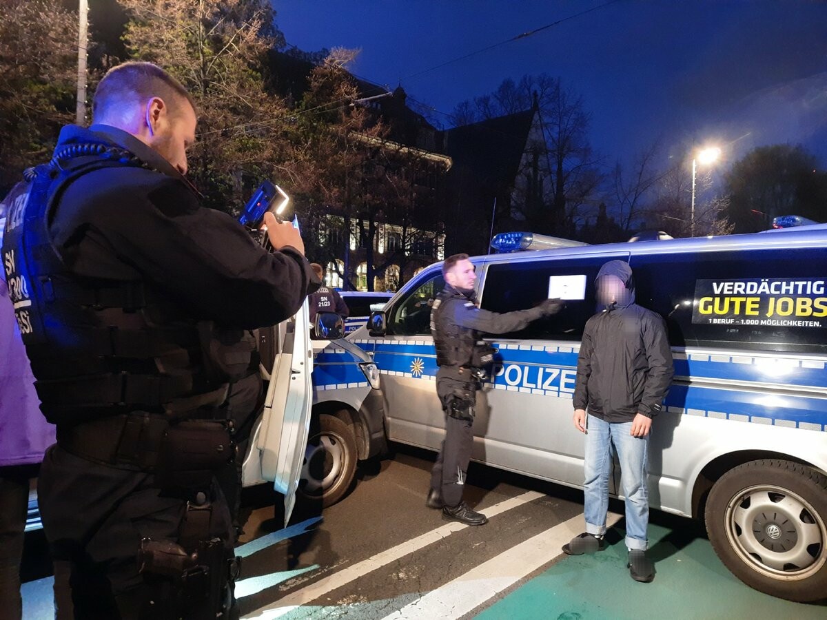 ID Feststellungen der Minderjährigen laufen, mit lautstarken, z.T. gebrüllten Anweisungen der Cops - man beachte auch nochmal das Logo auf dem Bullenwagen...
