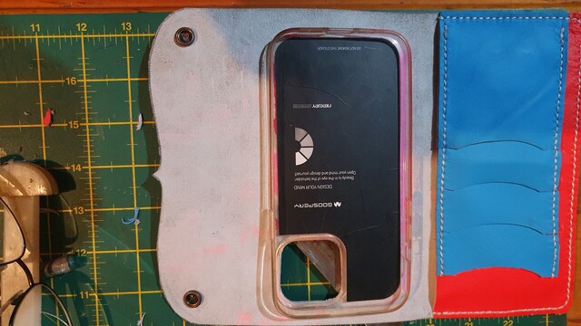 Replacement iPhone wallet under construction. Going to put spring clip on other side to the silicon holder. Made from sustainably harvested chrome tanned kangaroo leather. Picture taken before gluing the card holder pockets and saddle stitching. It should outlast the phone !