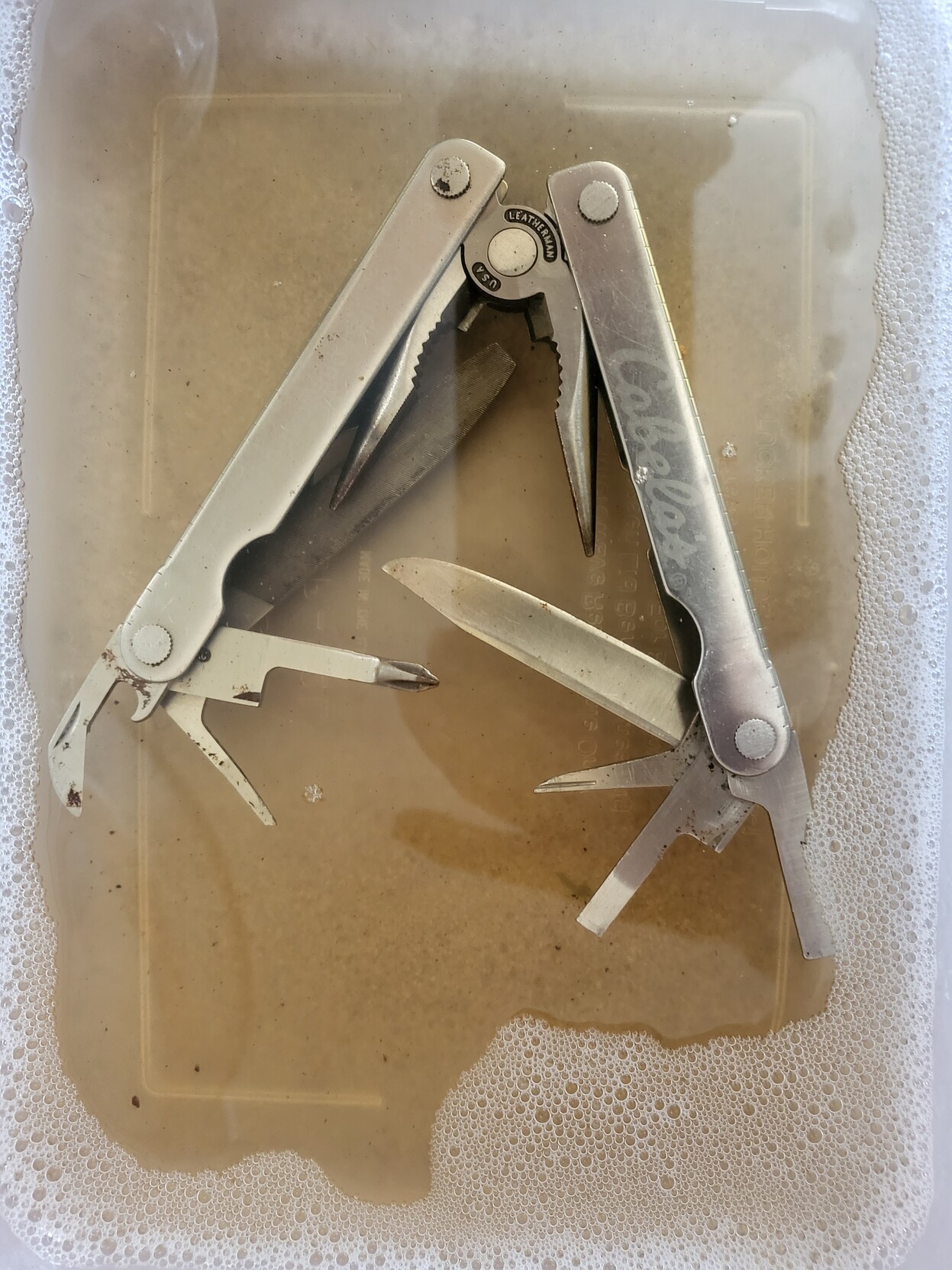 Found this ~30yo #leatherman PST while helping clean out an elderly person's garage yesterday. We were allowed to take items from the donation pile, and this was one of the things I picked up. I now have it soaking in some Evaporust.
