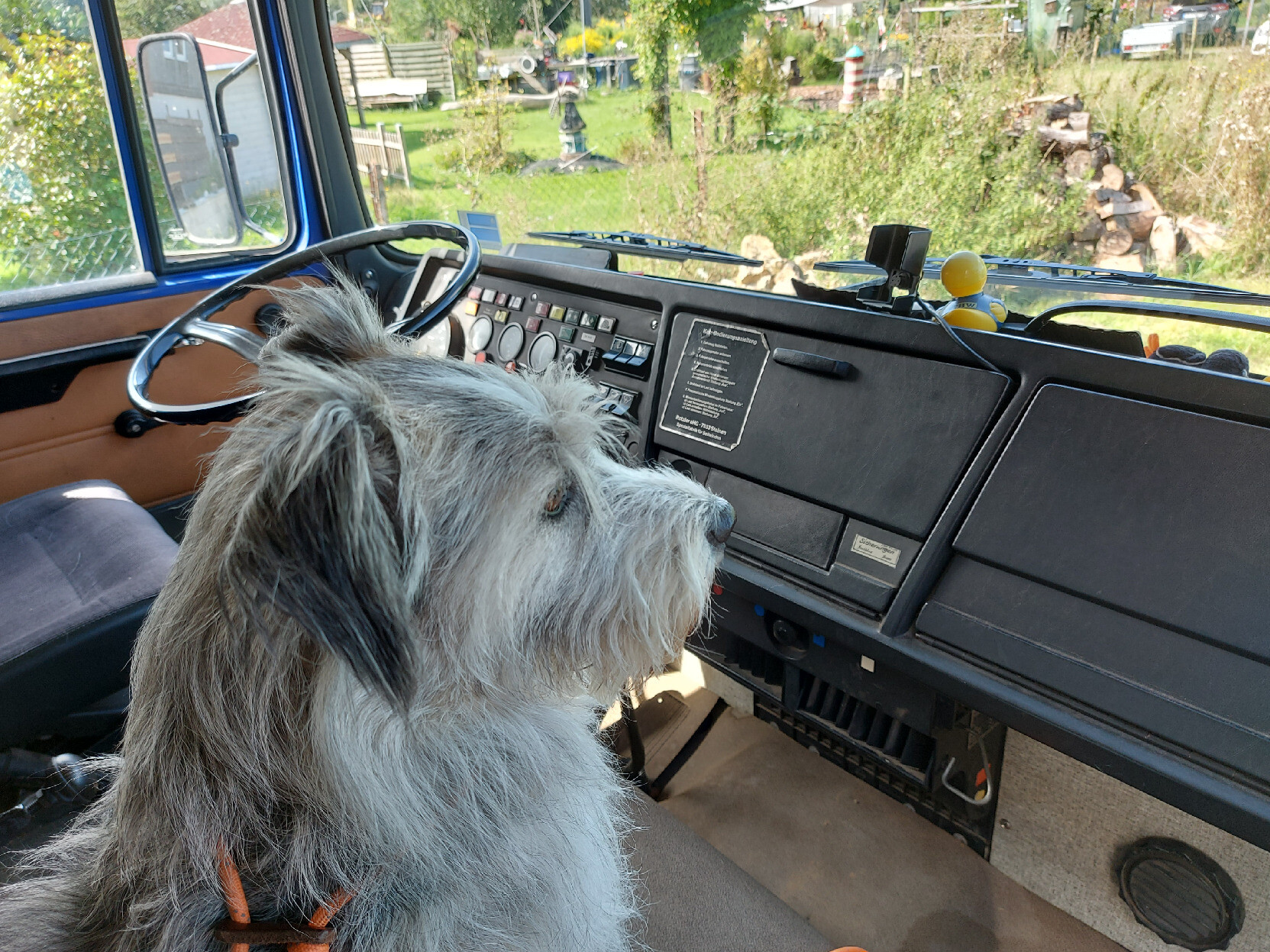 Terry liebt den LKW. Ab und zu mal drin sitzen muss sein. Selbst wenn der Laster nur geparkt ist.