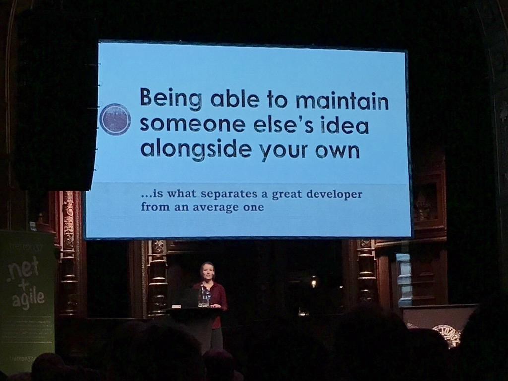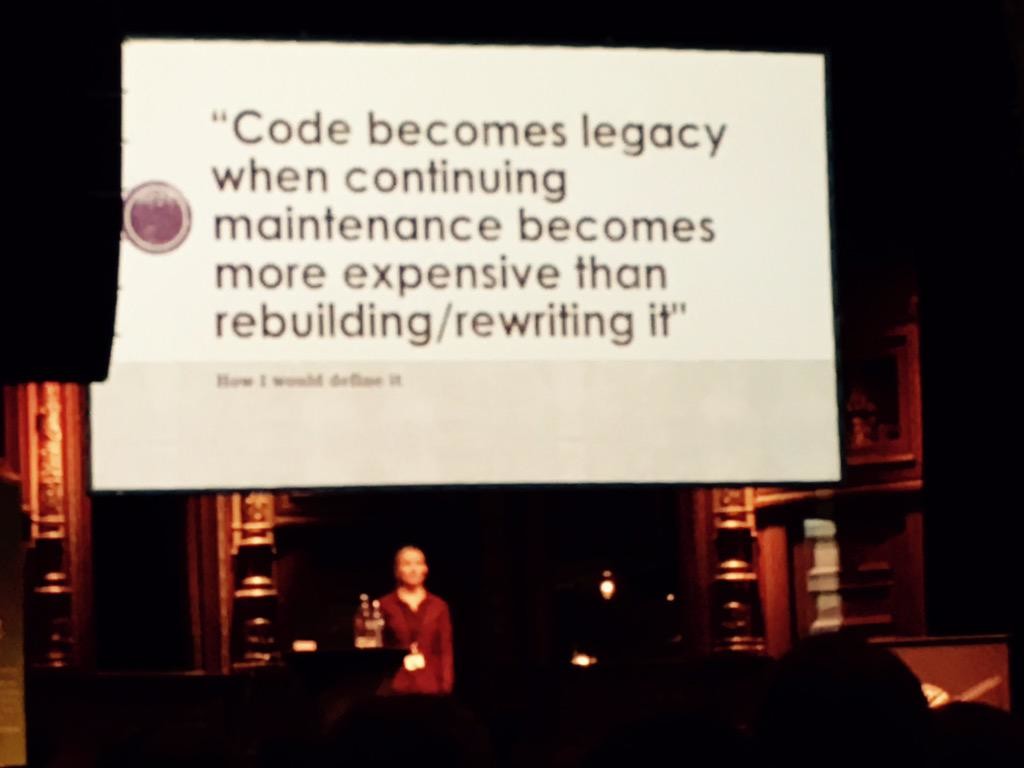 "We rewrite code too often instead of improving existing ones mostly because wrong reasons @karolikl #leetspeak" (Karoline Klever via Rui Carvaho - https://twitter.com/rhwy/status/652846879680671744)