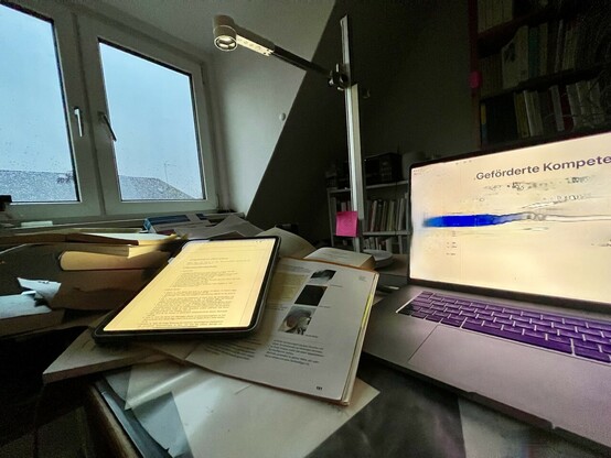 Klar, diese Form des Arbeitens macht auch Spaß. Es ist schön, die Bücher zu nutzen, die Aufsätze im PDF zu studieren und in den Entwurf einzubauen. Und nun, da es herbstlich windet und regnet erst recht. Da dies aber zusätzlich und kurzfristig an mich herangetragen wurde, durfte ich heute im Home-Office sein. Immerhin. –