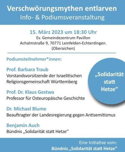 Zur Erinnerung: am 15.3.23 findet in #Leinfelden-#Oberaichen bei #Stuttgart anlässlich des geplanten Auftritts von Verschwörungsguru Daniele Ganser die Info-& Podiumsveranstaltung "Verschwörungsmythen entlarven" statt. Ganser soll im Mai in der städtischen Filderhalle auftreten. https://twitter.com/nazifreifilder/status/1632780232292696264