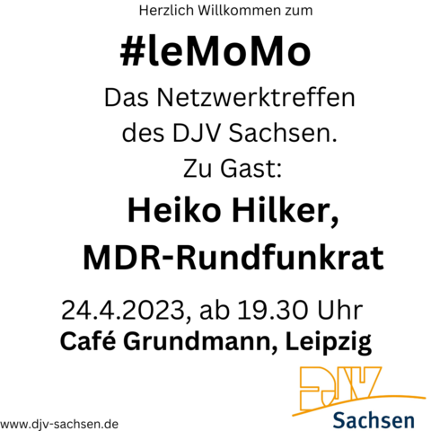 Heute Abend schon was vor? Es ist #leMoMo - das #Netzwerktreffen des @DJVSachsen. Unsere Vorsitzende Ine #Dippmann & Stellvertreterin @anmut79 laden zum Austausch. Motto: Raus aus der Krise. Medien (in #Leipzig) nach der Corona-Zeit. 19 Uhr, Café Grundmann. Infos: bit.ly/3Dkj9pW