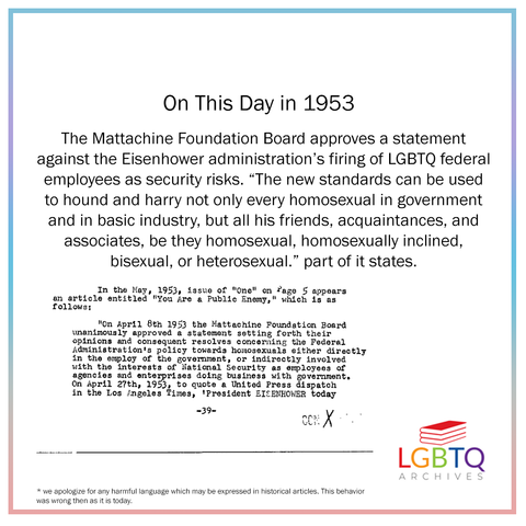 On this day in 1953, the Mattachine Society's board unanimously agreed to issuing a statement opposing the Eisenhower policy of firing LGBTQ federal employees as security risks. Part of it states: