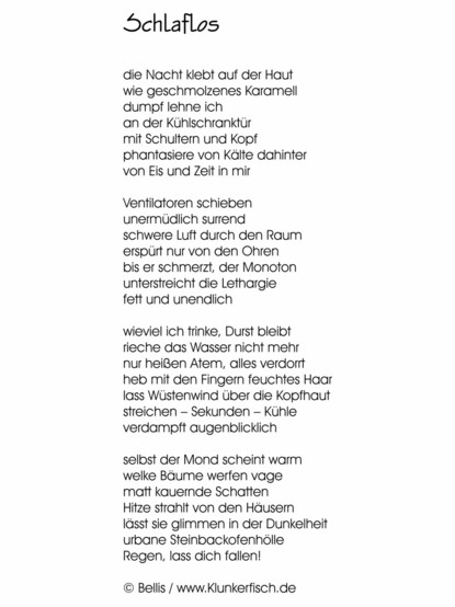 Was mir so einfällt, wenn ich nicht schlafen kann, weil es so warm ist ... Zu finden in meinem kleinen Gedichtband: https://www.klunkerfisch.de/produkt/my-valentine-gedichte-vom-lieben-und-sterben-2