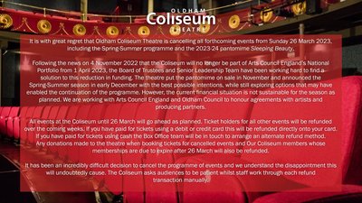 The future of the 140 year old Oldham Coliseum in doubt. A local theatre that championed the likes of Thora Hird. In a levelling-up priority area, the most deprived borough in the region. No pantos for these kids anymore. Just so infuriating and sad…