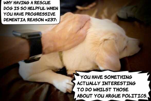 Getting a #rescue #dog is like step zero for new progressive #dementia patients, I can't recommend it highly enough. If you look at it one way, you will always have a kind and caring companion who cares not for your mental state. On the other hand, technically speaking you will be ensuring that you are never the dumbest mind in the room again. Your choice.