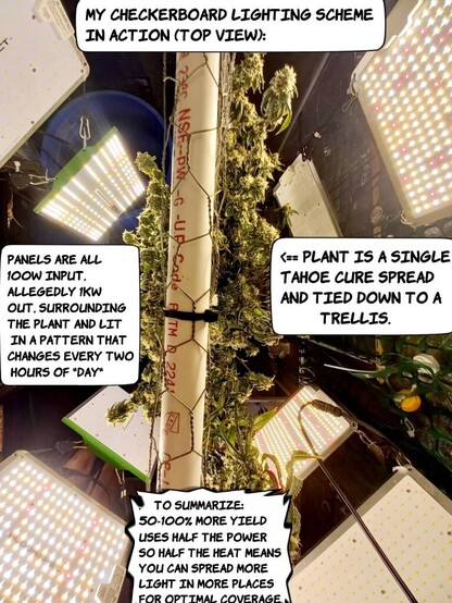 Greetings kids! Weird Assed Jeff here with the culmination of my grow system. The net results of ensuring every bud and leaf gets excellent air and light regardless of location on the plant are you get tops all over the plant, not just the top few. With the addition of a single dual timer I can light my plants in a variety of unorthodox ways getting the absolute most of them.