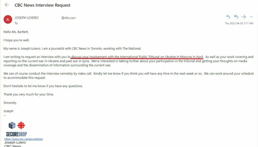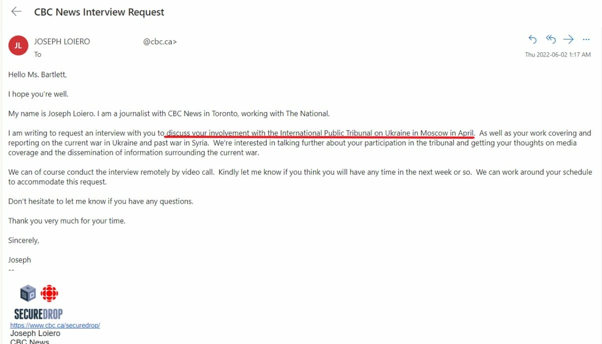 How cute: instead of doing a report on the fact that Ukraine has me on a kill list for my journalism, Canadian state-funded CBC seems to be gearing up to do a smear on my participation on a tribunal on Ukraine's war crimes.