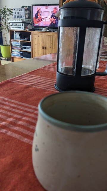 Und trotzdem auf dem Weg nach Hause noch gut nass geworden. Aber was soll's!? TĂ€sschen Kaffee â und was vom #Lieblinxbarde per Chromecast auf'm TV.