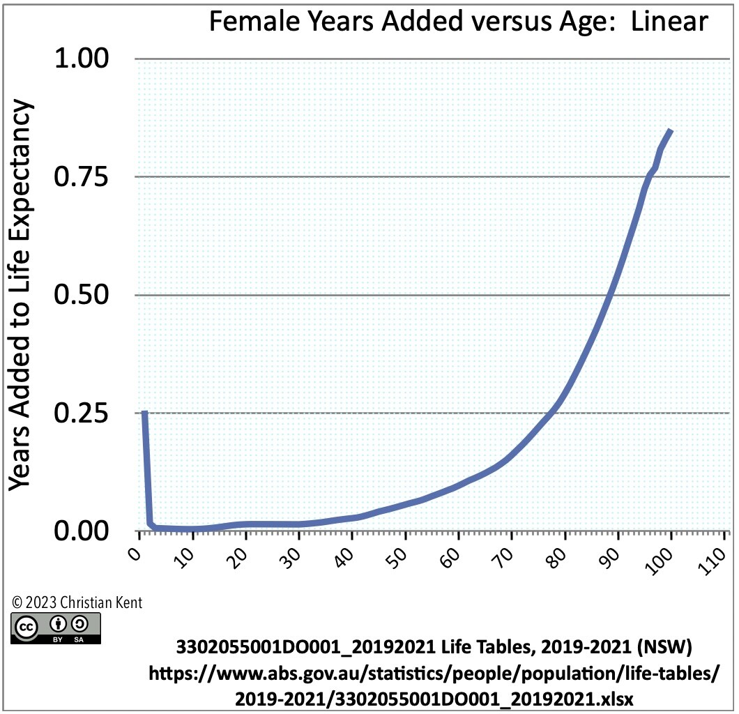 I was wondering if it tended towards 1.0 per year — possibly at 110? But no, my old friend "view logarithmic" revealed a hint of diminishing returns after 95.