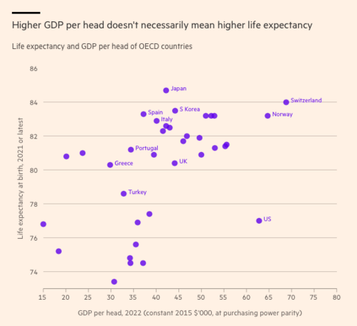 If we equate wellbeing with #lifeexpectancy (which I accept is a quantity theory of life not a qualitative one), then what is striking is the country (USA) who many would argue is the most #capitalist major economy in the world, is failing to deliver on exactly that metric;