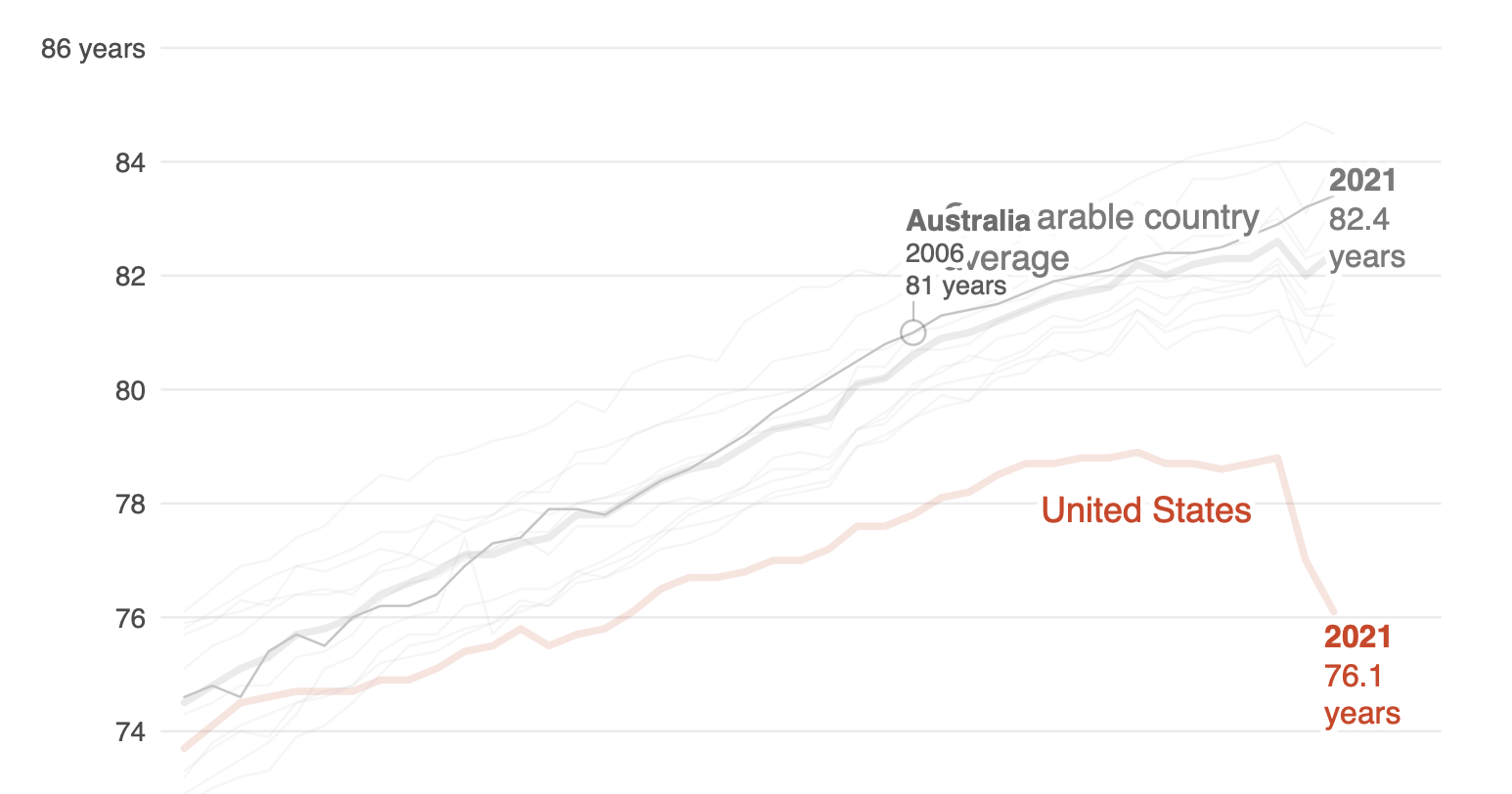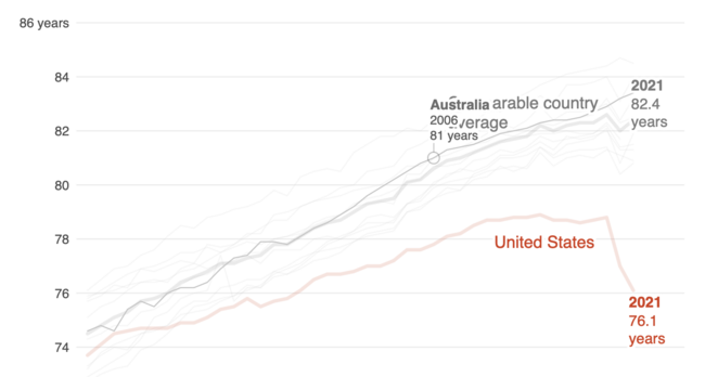 "federal health officials confirmed life expectancy in #America had dropped for a nearly unprecedented second year in a row – down to 76 years. While countries all over the world saw life expectancy rebound during the second year of the pandemic after the arrival of vaccines, the U.S. did not."