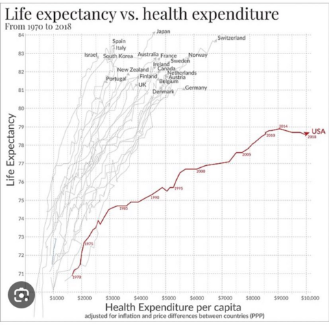 I'm going to repost an image from the birdsite without fact-checking it. I'm guessing this is true, and it has some truthiness to it, but is it true? Are the lines assoicated with #Japan, #Israel, and #Switzerland more or less correct vis a vis per-capita spending and life expectancy? #healthcare #USA #lifeexpectancy