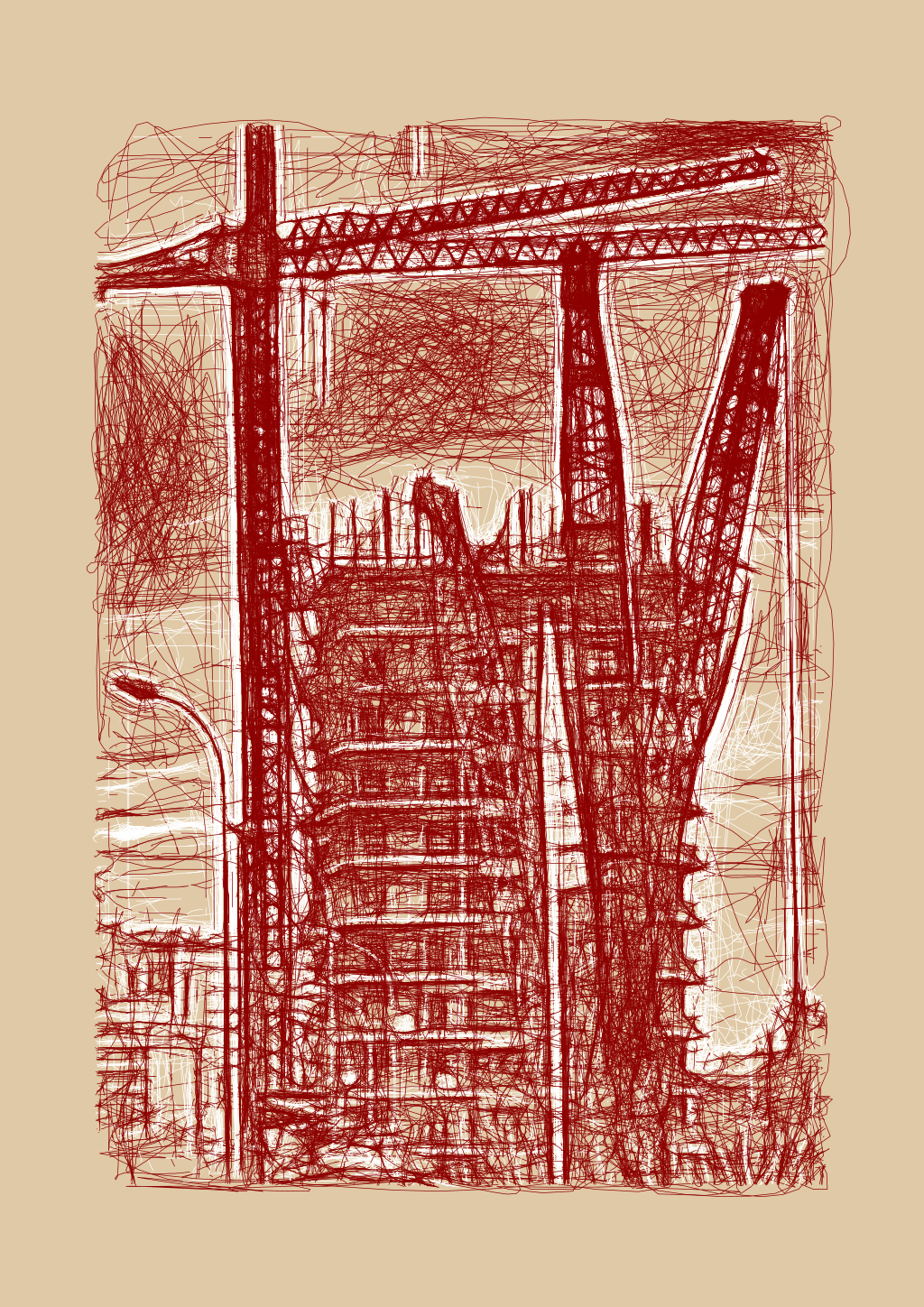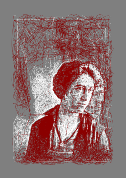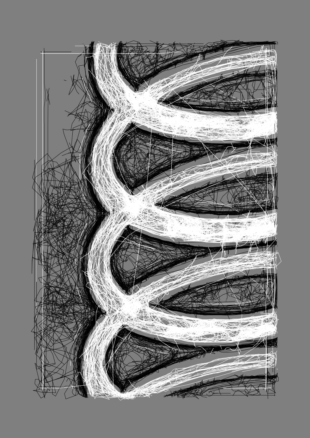 The artwork was produced with a original line drawing algorithm seeded from an original photograph from the Internet Archive.